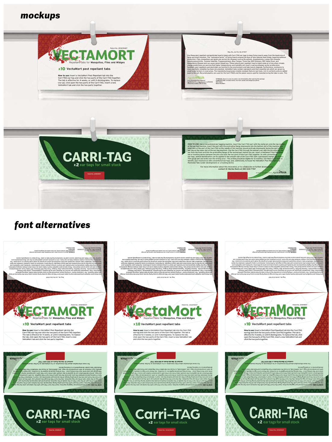 Carri-TAG is a cattle tag that is designed with a compartment to hold items; VectaMort is a satchel that can be inserted into the Carri-TAG’s compartment in order to repel disease-carrying pests that often swarm around livestock animals’ heads.